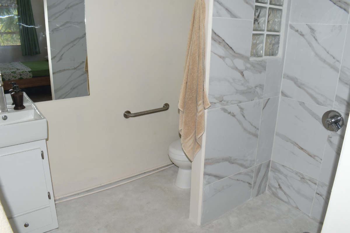 The living space features an open-concept design giving ample space for entertaining guests and for an additional room. This house boasts 2 spacious twin-master bedrooms with en-suite bathrooms. The tall windows allow plenty of sunlight for a bright living room. The bathroom walls are elegantly tiled giving a contemporary feel. They are well lit with fancy upgrades. Both bedrooms feature closet space for efficient storage. The kitchen is large and features ample storage space with lower, hardwood custom cabinets. The large living area is perfect for entertaining guests. This house is strongly built to support a second story for additional space or for a rooftop terrace.